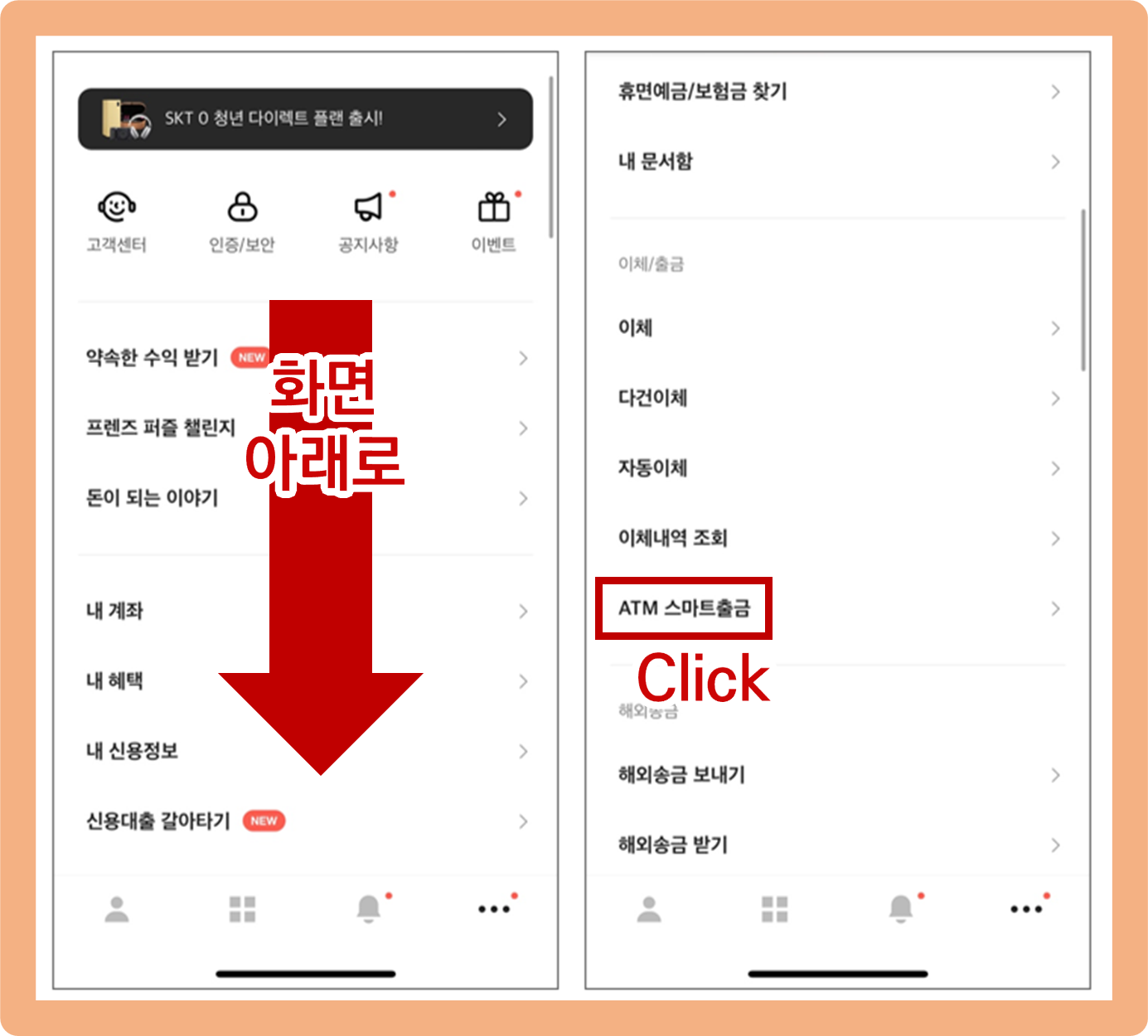 여기서 화면을 아래로 조금 내려주시면 이체/출금 탭에 'ATM 스마트출금' 메뉴가 보여요. 이 버튼을 클릭해주세요.