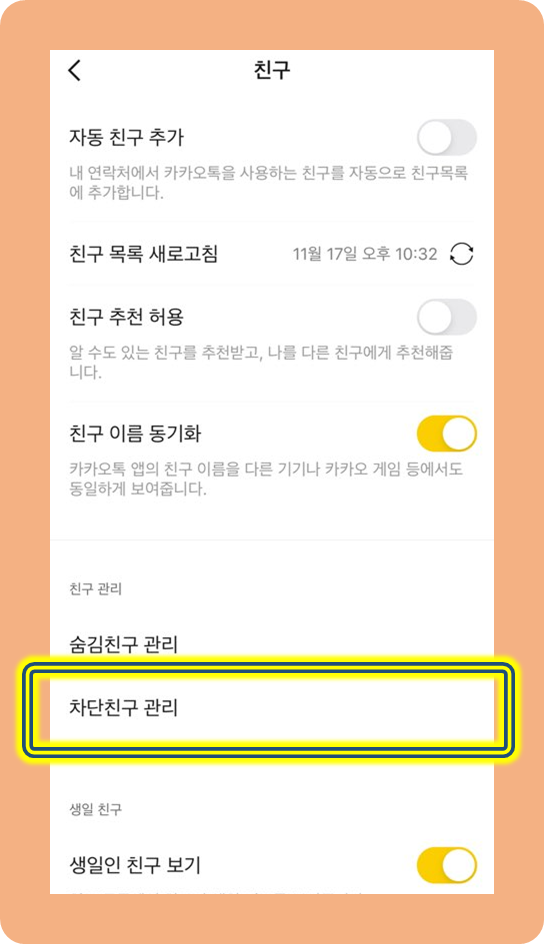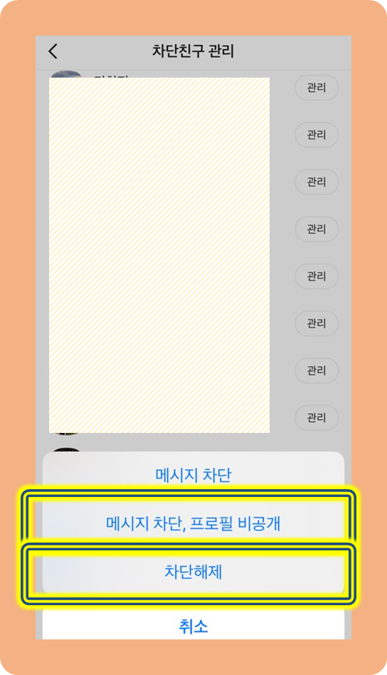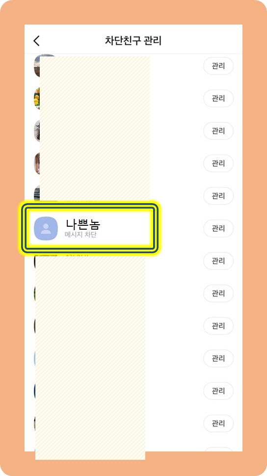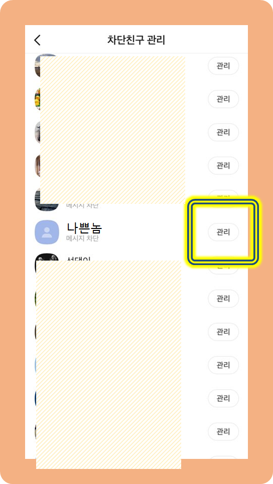 차단한 친구 옆에 있는 관리를 먼저 눌러주세요.