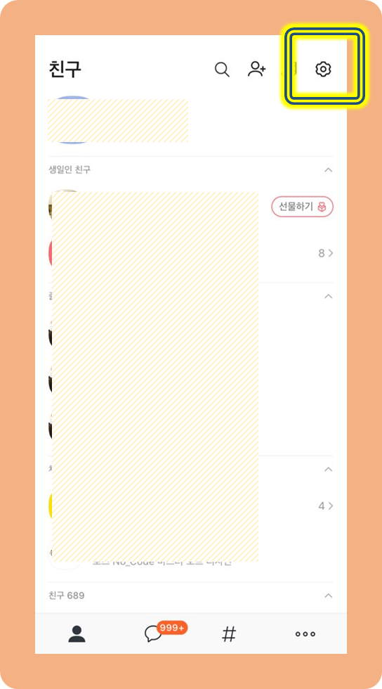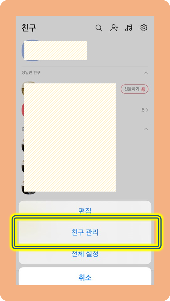 그러면 숨긴친구 관리, 차단친구 관리 같은 새로운 메뉴가 여기 보일 거예요.