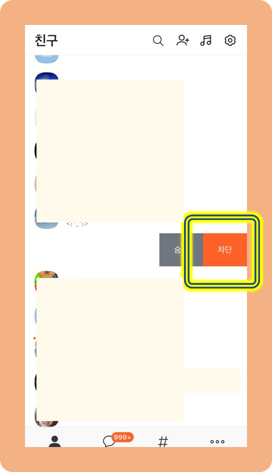 오른쪽 그림과 같이 숨김 단추와 차단 단추가 나타납니다. 여기서 차단을 누릅니다.