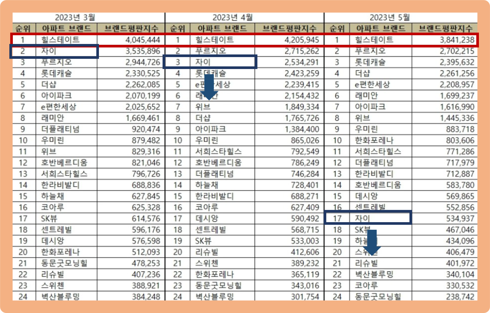 그리고 지난 3월까지만 해도 2위였던 GS건설의 '자이' 브랜드는 4월에 3위로 한 계단 내려갔으며, 5월에는 무려 17위까지 곤두박질쳤는데요.