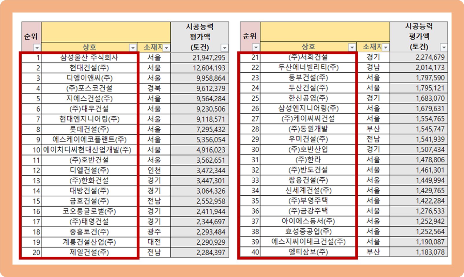 너무 방대해서 모두 올릴 수 없으므로, 상위 40곳 건설사 순위를 알아볼게요.