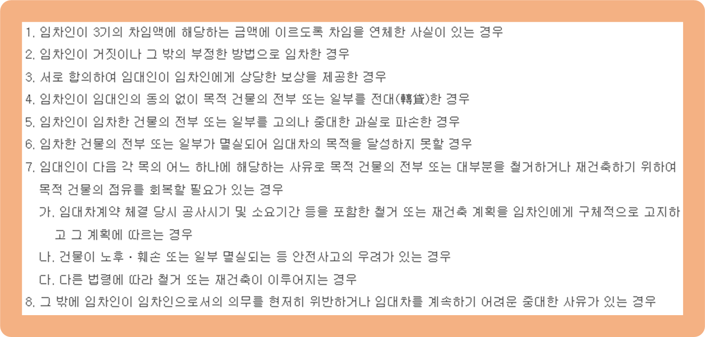 위 8가지의 사유중 하나라도 해당되면 임대차 계약 기간이 10년이 지나지 않았더라도 임대인은 계약 갱신을 거절할 수 있어요.