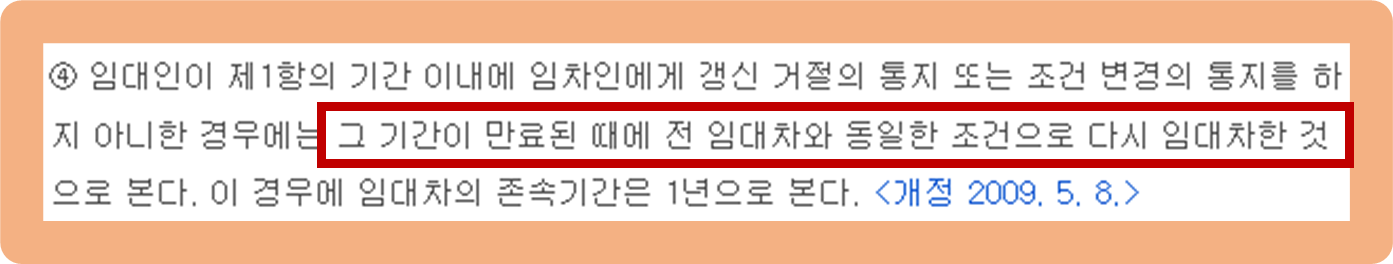 만약 임대차 계약 종료 6개월 전부터 1개월 전 사이에 임대인이 임차인에게 갱신 거절 or 조건 변경에 관한 별다른 통지를 안 했다면, 이때 묵시적 갱신이 인정돼요.