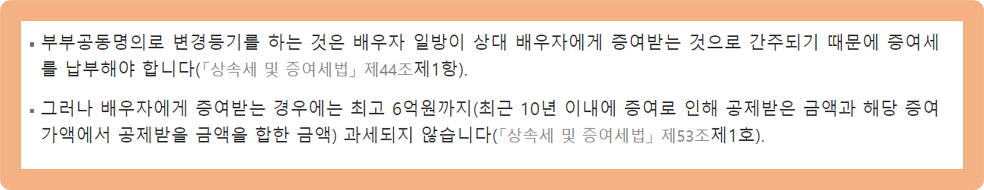 물론 배우자끼리는 최고 6억원까지의 증여까지 세금이 부과되지 않으므로, 이 점 참고해서 진행해주시면 돼요.