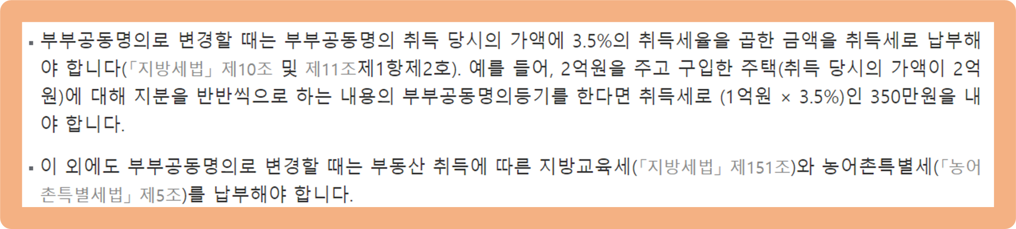 공동명의로 변경할 때에는 취득 당시 부동산 가격에 3.5%의 세율을 곱한 취득세를 납부해야할 의무가 발생해요.