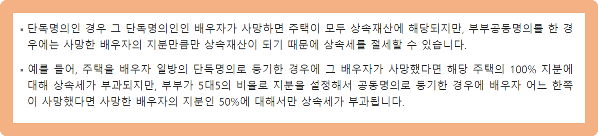 예를 들어, 부부가 5:5로 지분을 설정한 경우 어느 한쪽이 사망했다면 50%의 지분에 대해서만 상속세가 부과돼요.