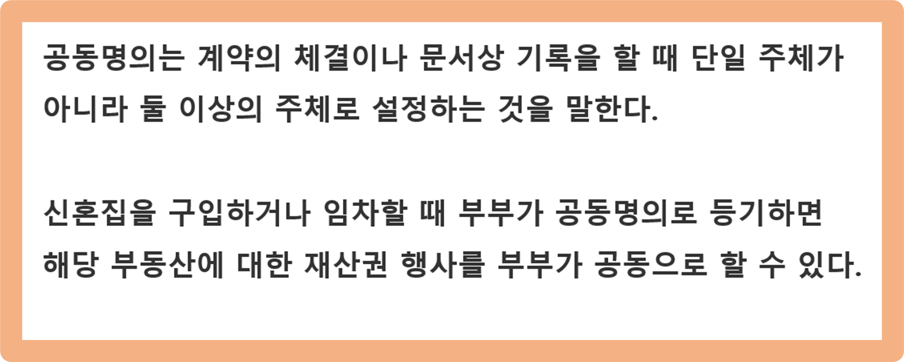 만약 부부가 아파트 등을 공동명의로 등기하게 되면 해당 주택에 관한 권리를 함게 갖게 되며, 재산권을 공동으로 행사할 수 있게 되는 것이죠.