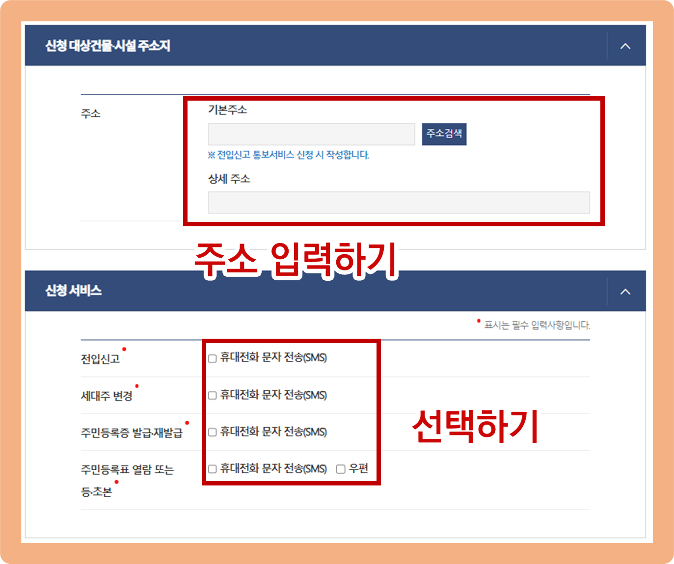 전입신고 통보서비스 무료 신청, 주소 입력 및 신청 서비스 선택