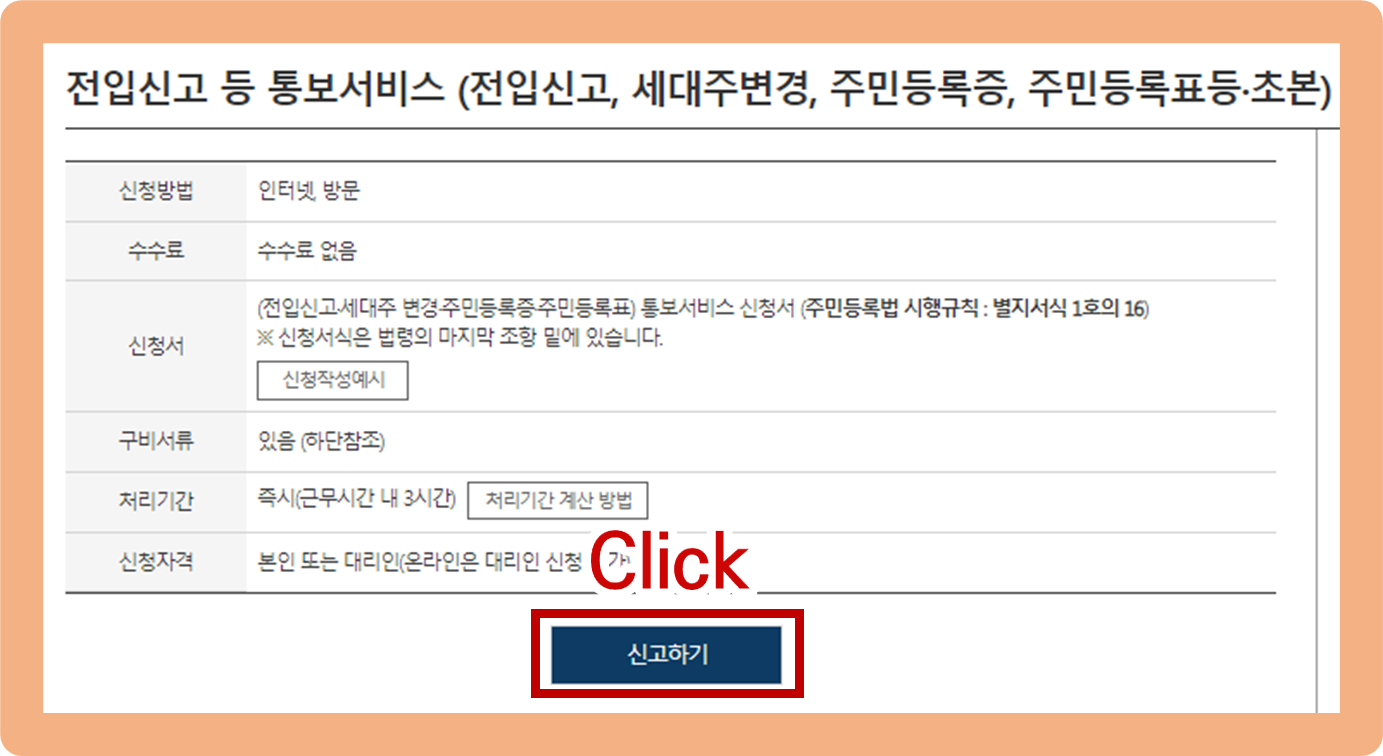 전입신고 통보서비스 무료 신청, 신고하기 클릭