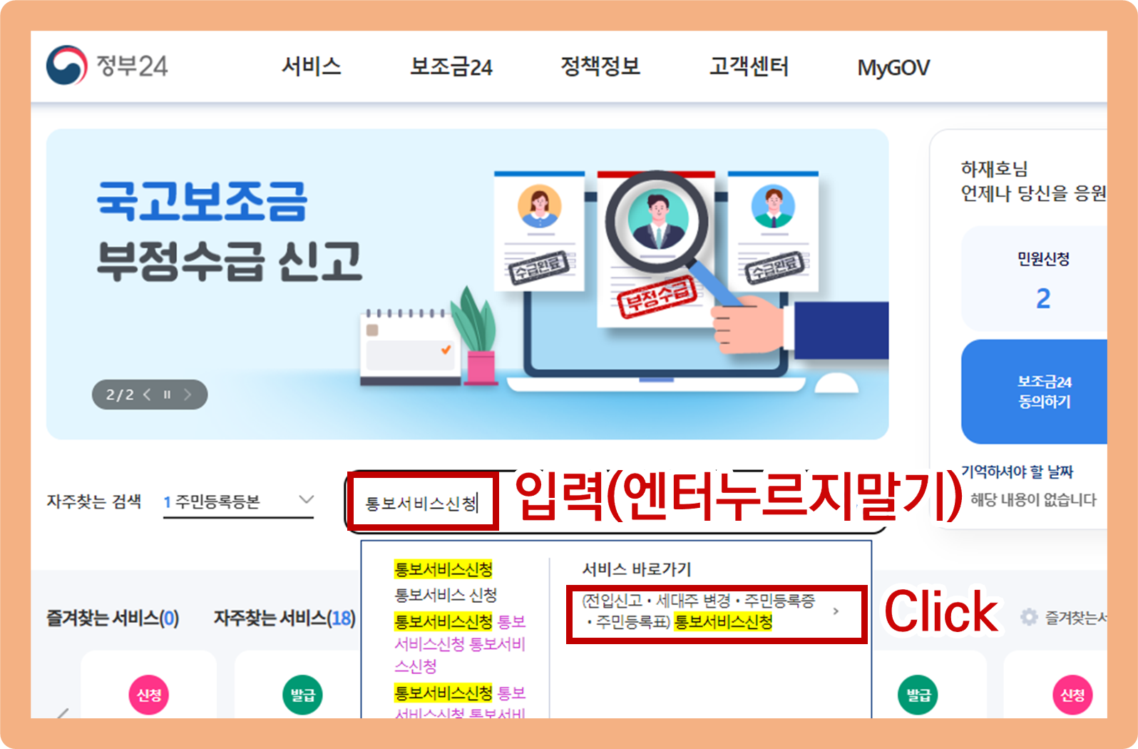 화면 중간에 검색창이 보이실거에요. 여기에 '통보서비스신청'을 입력 후 엔터는 누르지 말아주세요.