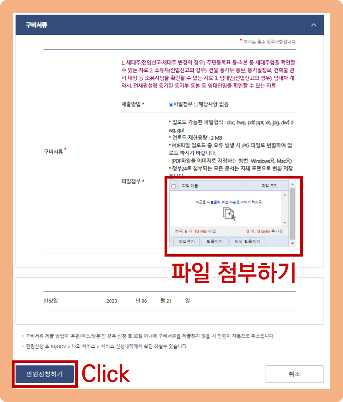 그 다음으로는 신청에 필요한 서류를 첨부하시면 되는데요.