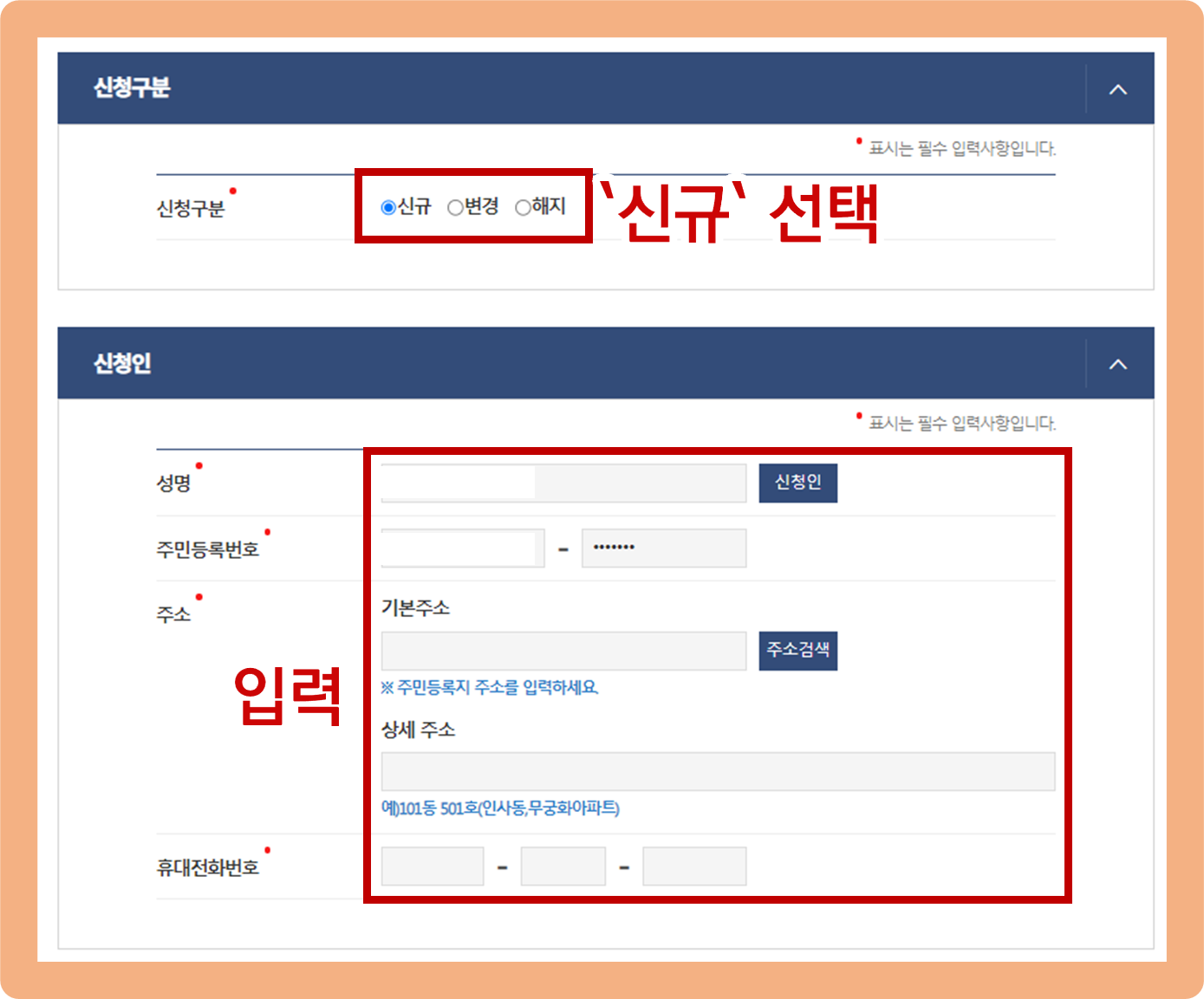 처음 신청하시는 분들은 신규, 변경, 해지 중 '신규'에 체크되어 있으실 거에요. 그대로 냅두시면 되구요.