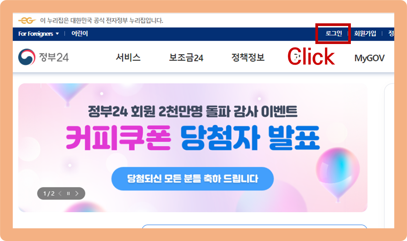 해당 서비스를 신청하기 위해서는 정부24 홈페이지를 접속해주셔야 하는데요.
