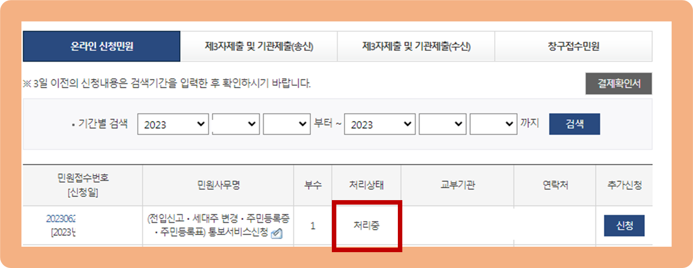 신청 직후에는 처리상태가 '처리중'으로 되어있지만, 관할 기관에서 해당 업무를 처리해주면 '처리완료'로 변경될 거에요.