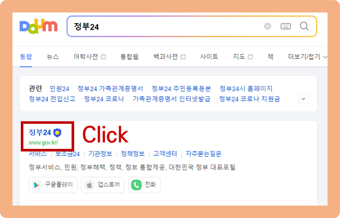 검색창에 '정부24'라고 검색하시면, 제일 싱단에 공식 사이트가 나오는데, 여기로 접속해주시기 바랄게요.