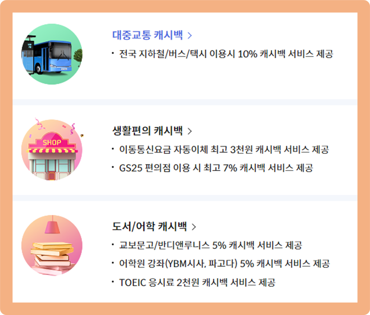 신한 알뜰 교통카드 체크카드, 대중교통 / 생활편의 / 도서 및 어학 캐시백 혜택