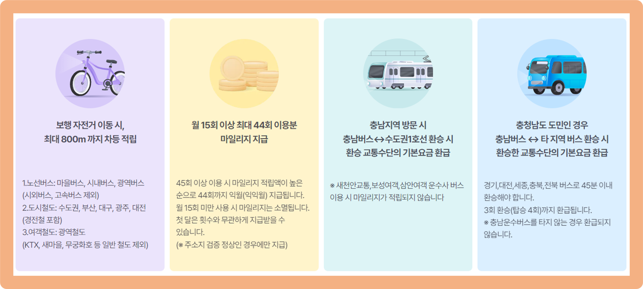 3. 충남지역을 방문한다면, 충남버스와 수도권1호선 환승 시 발생하는 기본요금을 환급받을 수 있어요.