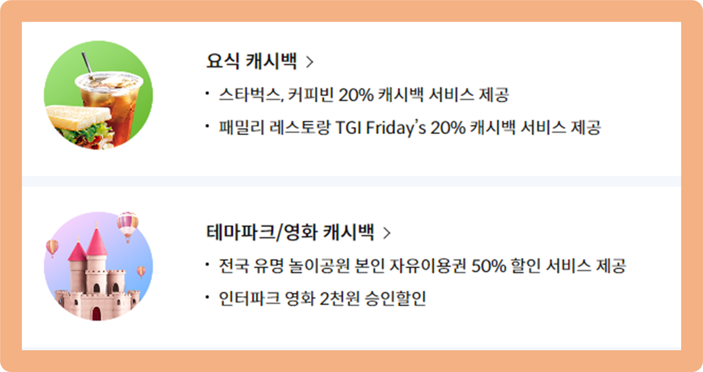 신한 알뜰 교통카드 체크카드 요식 / 테마파크 / 영화 캐시백 혜택