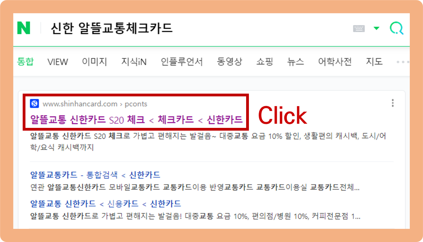 검색창에 '신한 알뜰교통체크카드'라고 입력해주시면 바로 상단에 발급 사이트가 나타나요.