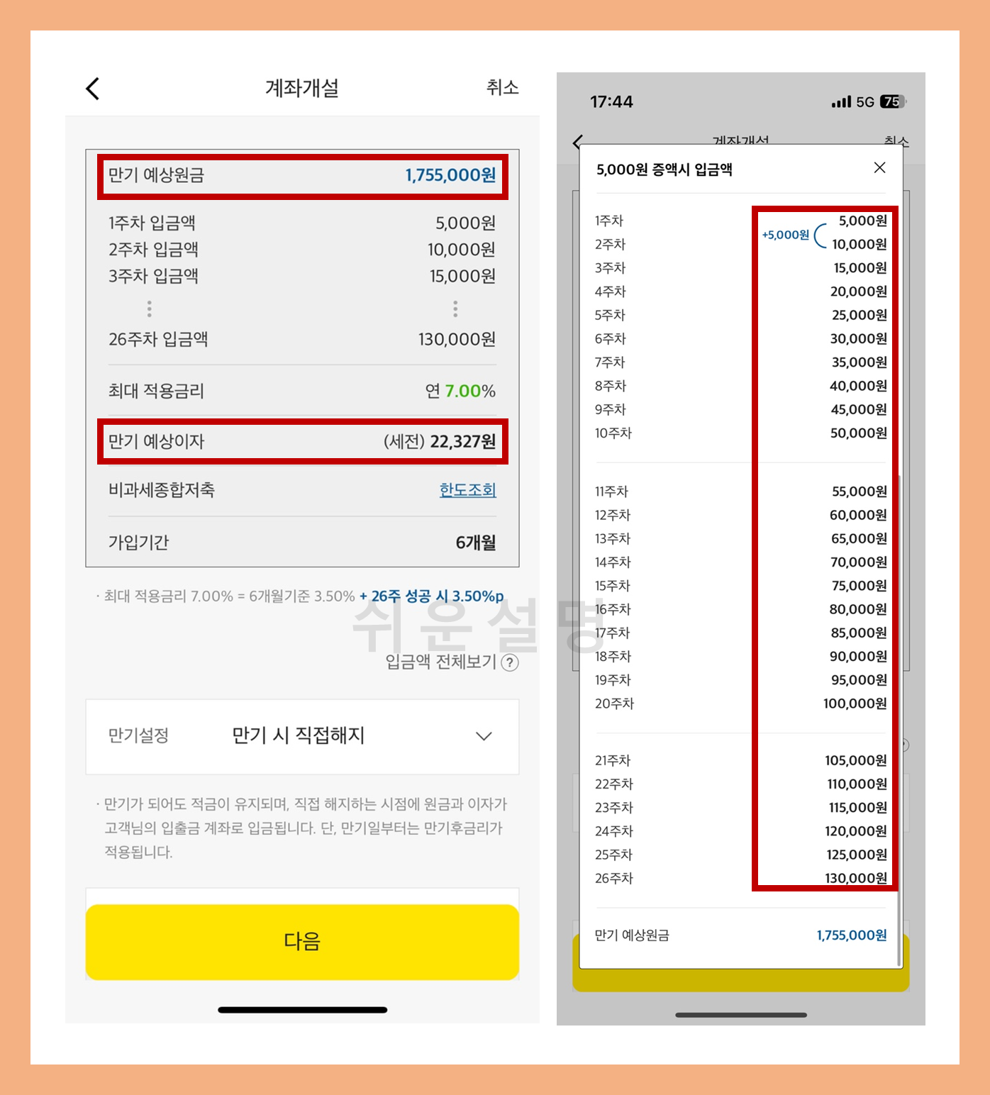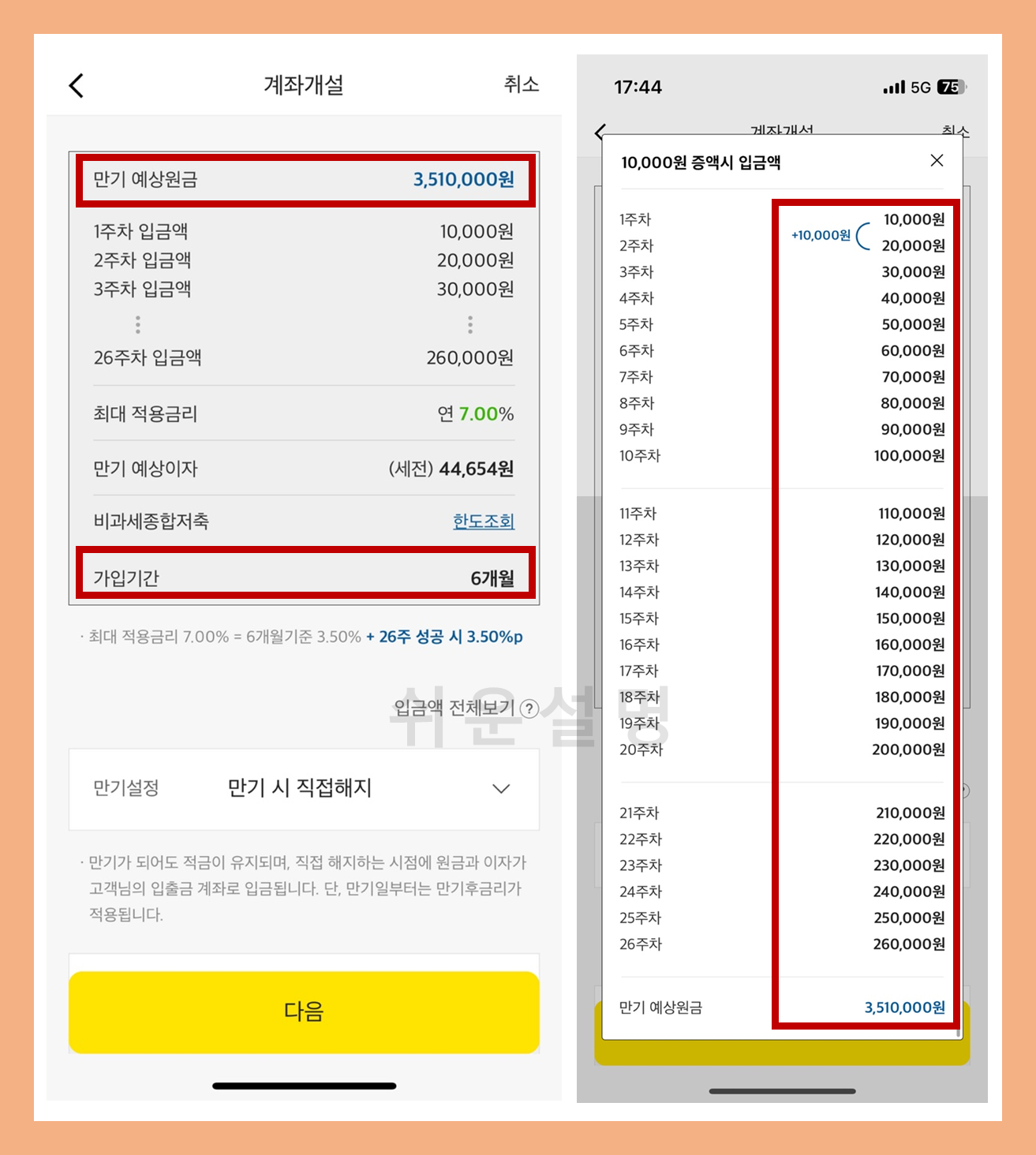 5,000원도 안되기 때문에 얼마 안 된다고 생각하실 수도 있지만, 매주 1000원씩 늘려가며 납입하면 6개월 후에 총 35만6천원 정도가 모이는 것이니 막상 재미를 느끼실 수 있을거에요.