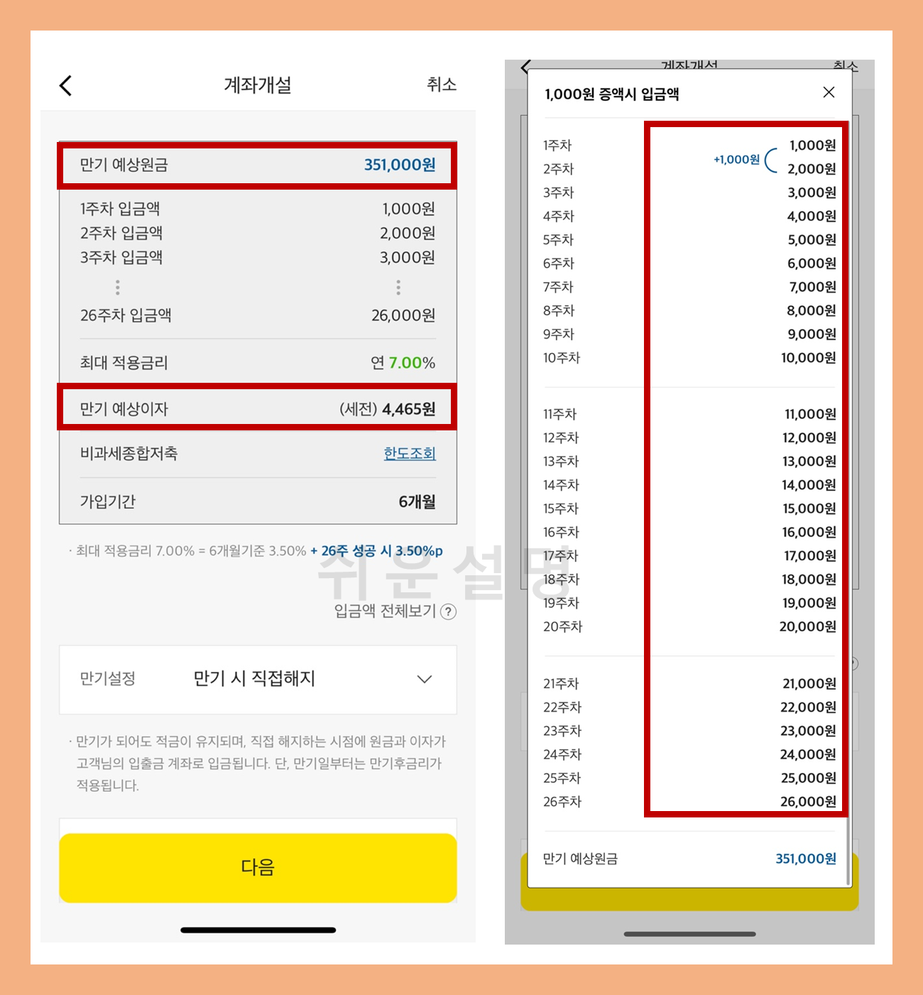 매주 1000원 증액 조건으로 가입한다면, 1주차 1,000원 2주차 2,000원, 그리고 26주차에는 26,000원을 납입해야 되며 이 기간 동안 납입해야 되는 원금은 총 351,000원이에요.