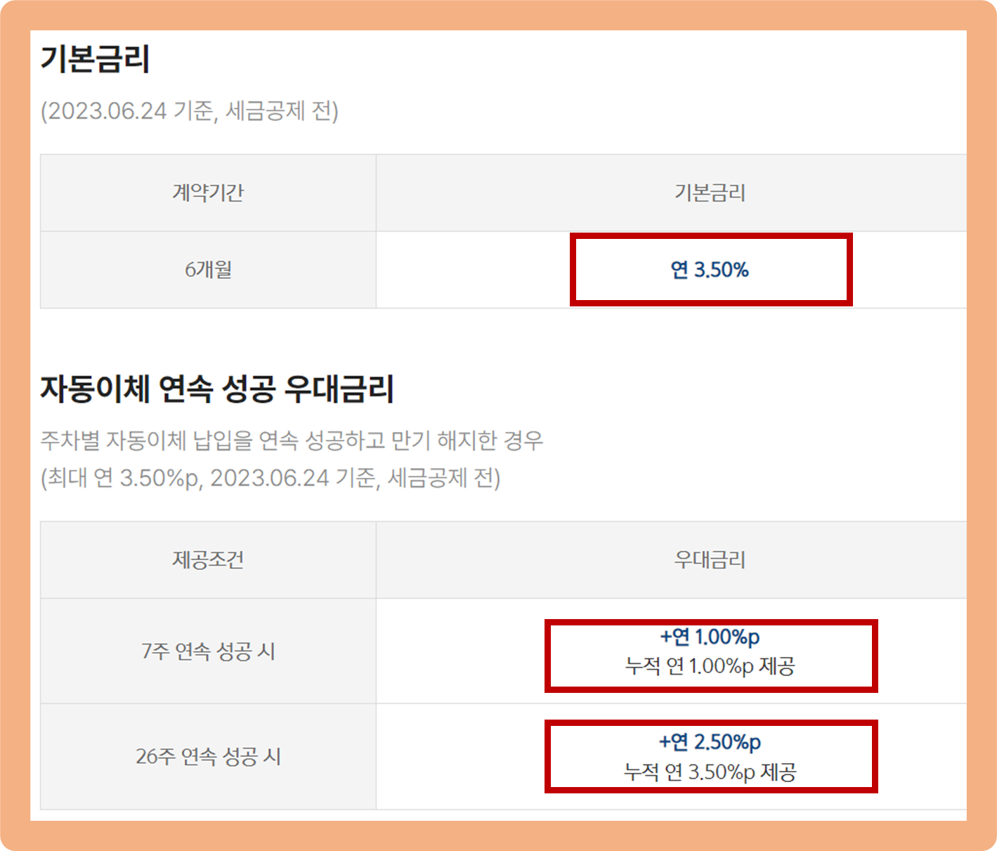 총 26주 중 첫 7주 동안 납입을 성공하면, 1%p의 우대 혜택이 추가되어 금리가 4.5%로 상승하구요.
