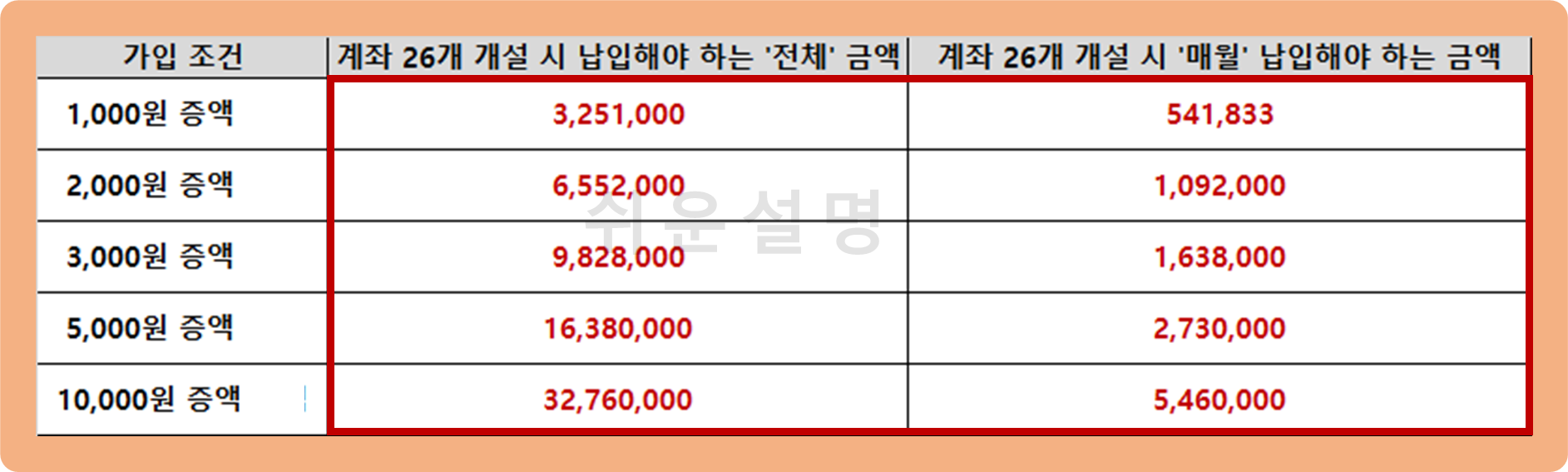 이 26개의 모든 계좌가 만기가 되었을 때, 6개월(26주) 동안 적금만을 위해 투입되는 금액을 계산해볼게요.