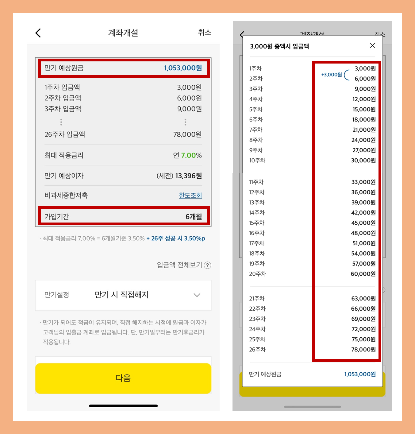 매주 3천원으로 증액 선택 시 26주차 납입 금액 : 78,000원.
