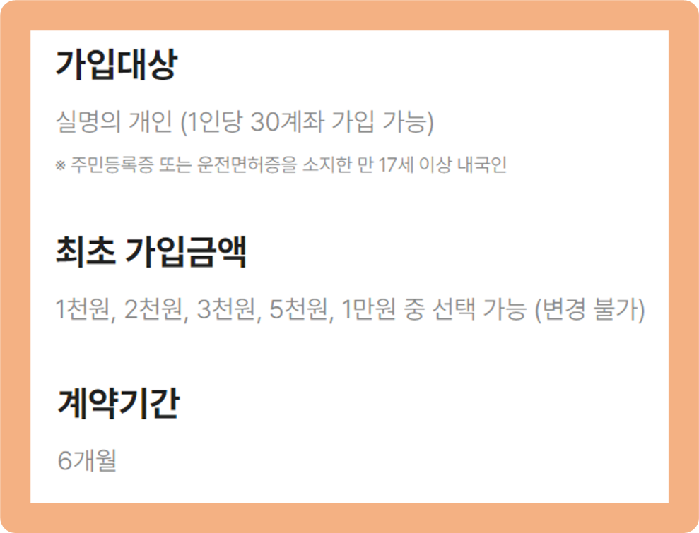 -가입 금액 : 1000원, 2000원, 3000원, 5000원, 10000원 중 선택 가능하며, 최초 신청 후 변경 불가능.