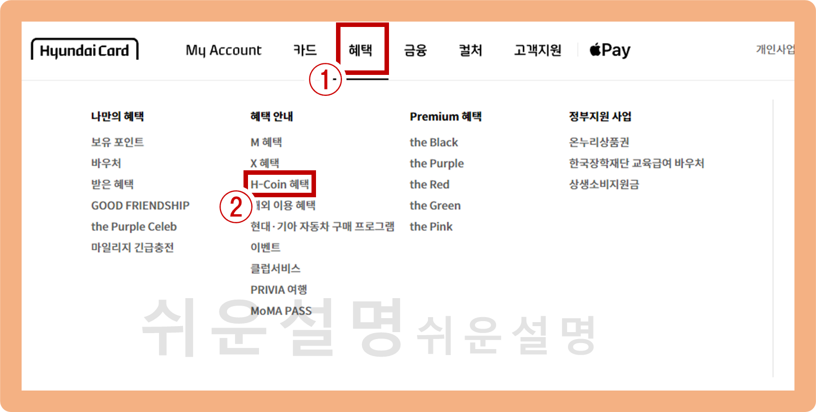 이 중에서 '혜택'메뉴 위에 마우스를 올리면 하위 메뉴들이 나타나요. 이 중 'H-Coin' 혜택' 버튼을 클릭해주세요.