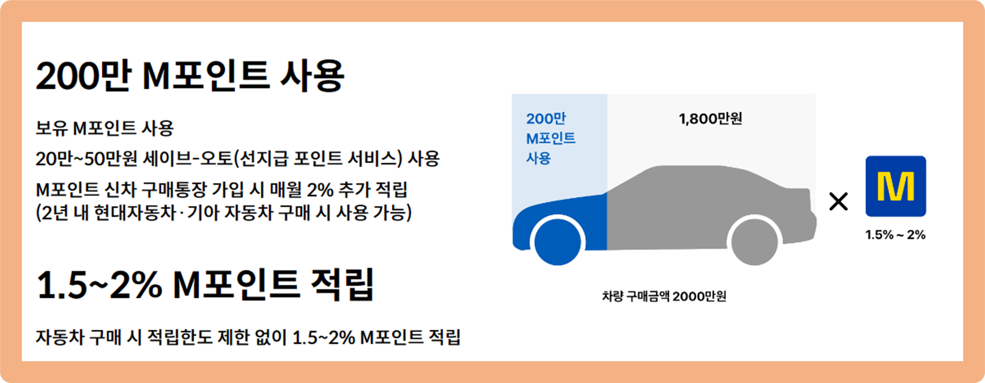 현대, 기아에서 신차를 구매할 때 차종에 상관없이 최대 200만 M포인트를 사용해 구매 가능해요.