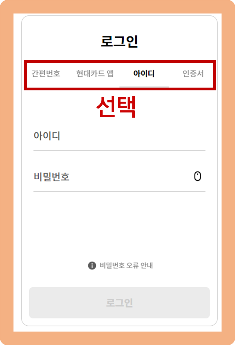 그 다음 로그인을 해주시면 되는데요. 간편번호, 현대카드 앱, 아이디, 인증서 네가지 방법이 중에서 여러분께 가장 편한 방법을 선택해 로그인해주세요.