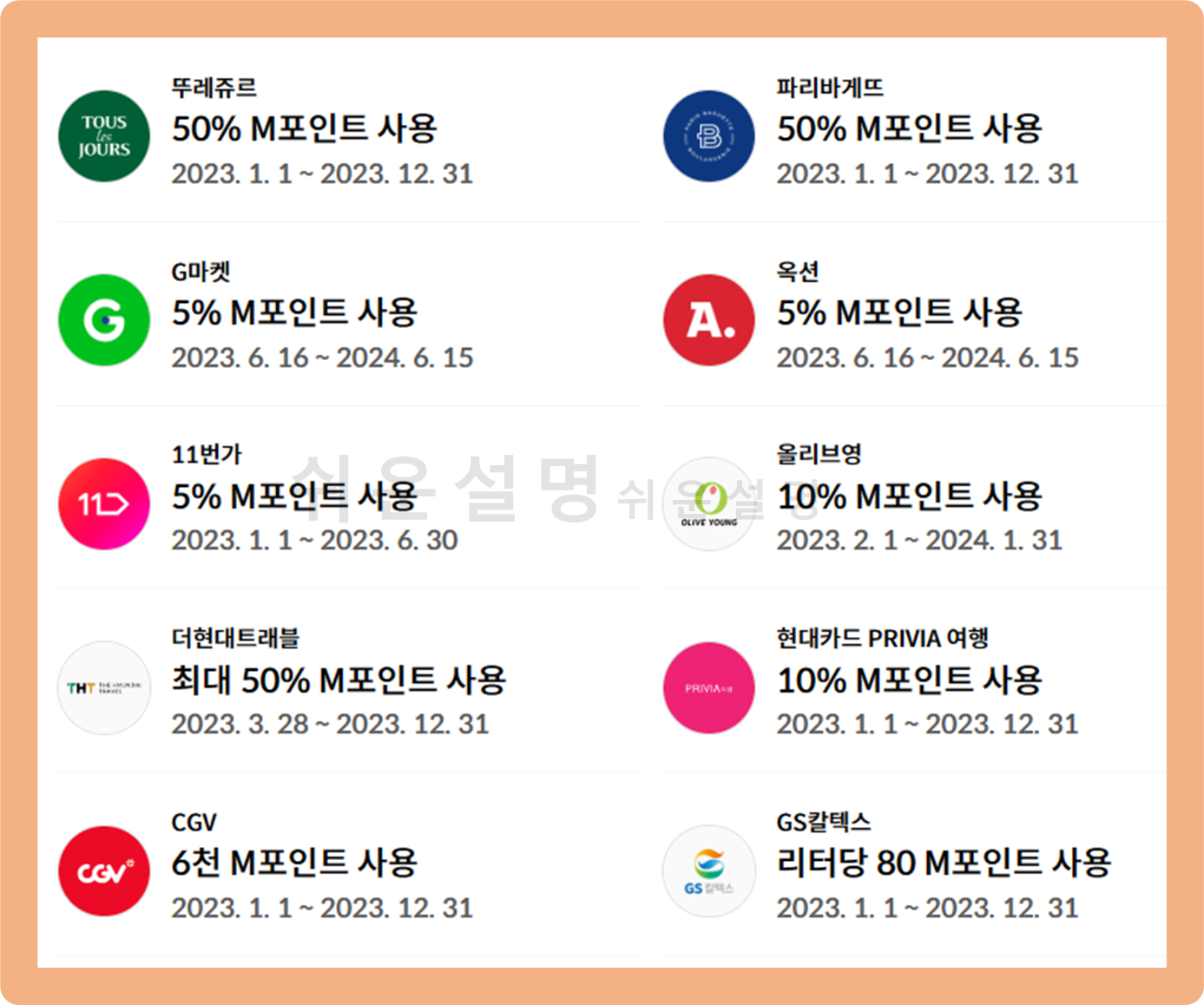 그리고 이 외에도 티몬, 아웃백, 빕스, 달콤, 베스킨라빈스, 던킨, 투썸, 파스구찌 등 다양한 업종에서 사용할 수 있어요.
