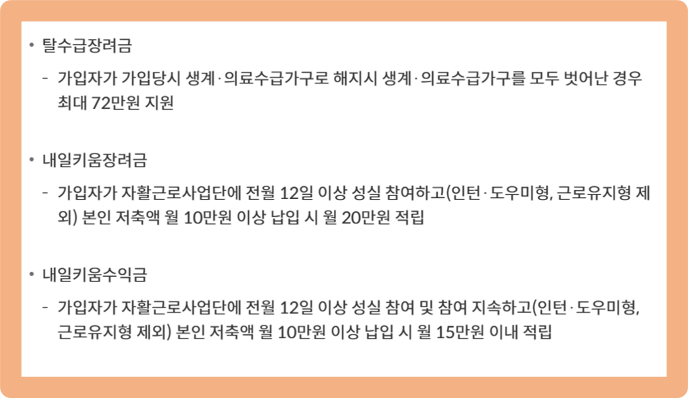 첫번째. 탈수급장려금 : 가입당시 생계 및 의료수급가구였던 가입자가 만기 해지 시 생계 및 의료수급가구에서 벗어난 경우 '최대 72만원 추가 지원'해줘요