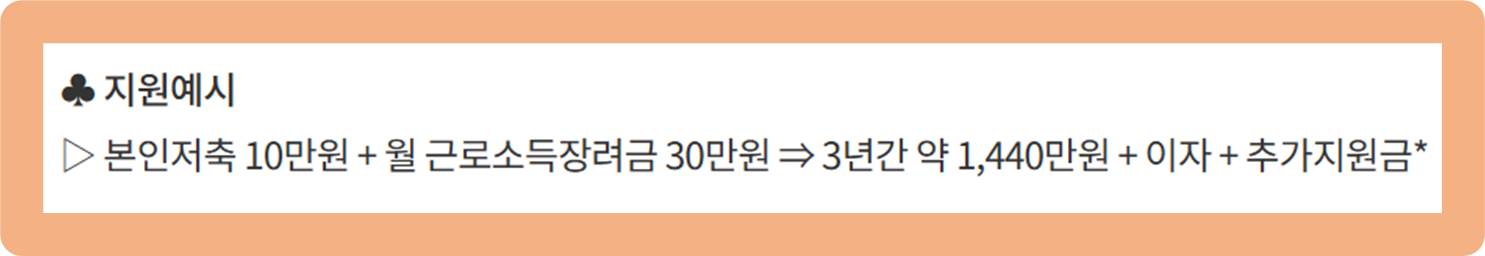 매월 본인 저축액 10만원과 근로소득장려금 30만원을 합해 가입 기간 3년 동안 적립한 뒤, 만기 해지 시 기본적으로 총 '약 1,440만원 + 이자'를 수령하게 돼요.