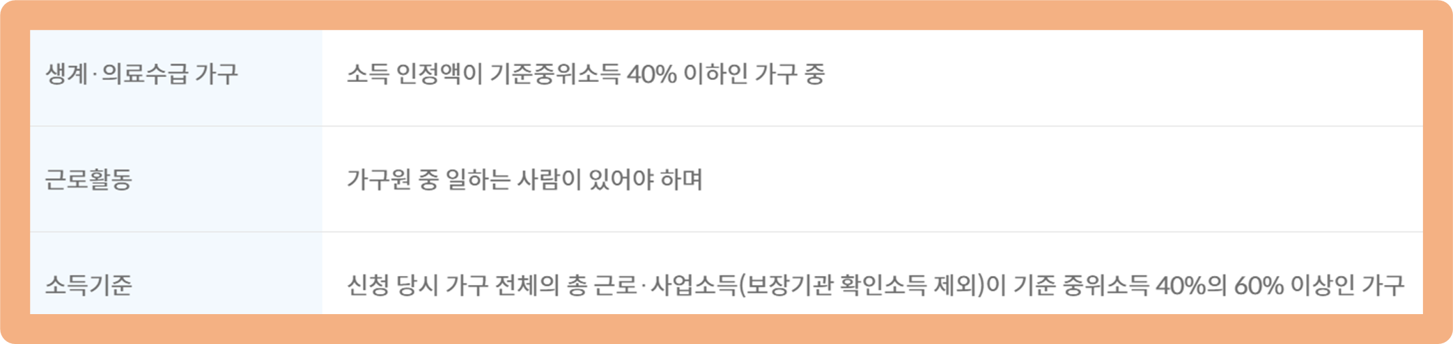 세번째. 해당 사업 신청 시 가구의 총 소득이 기준 중위소득 40%의 60% 이상.