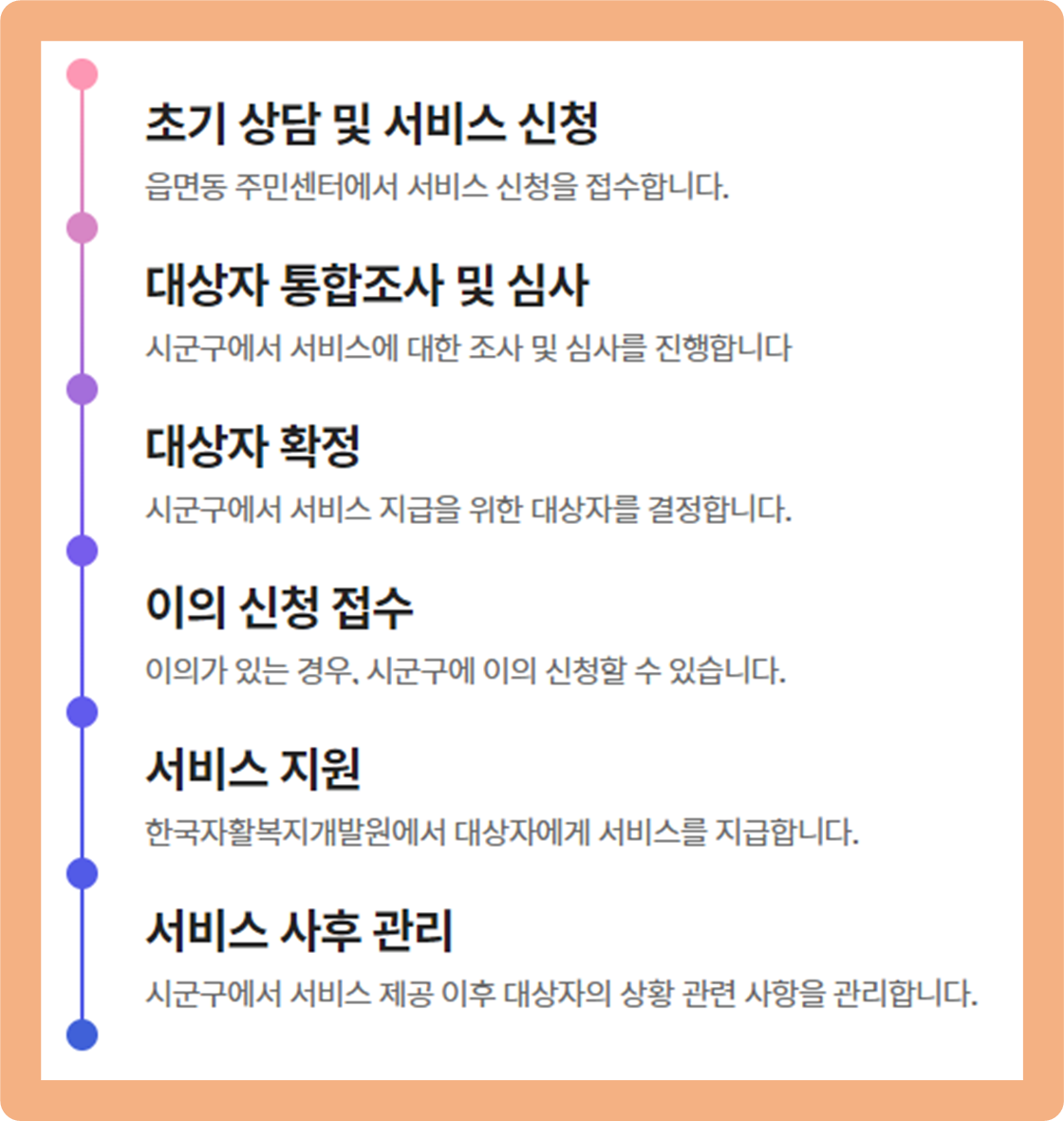 상담 및 서비스 1.신청 2.심사 3.대상자 선정 4.이의 신청 접수 5.서비스 지원 6.사후관리 순으로 진행돼요.
