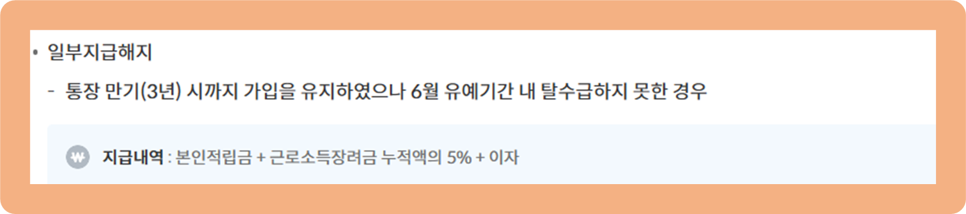 계좌 가입 기간 3년은 채웠는데, 그 이후 6개월 이내에 탈수급하지 못하게 되면, 아쉽지만 이때는 '일부 지급 해지' 기준으로 지급돼요.