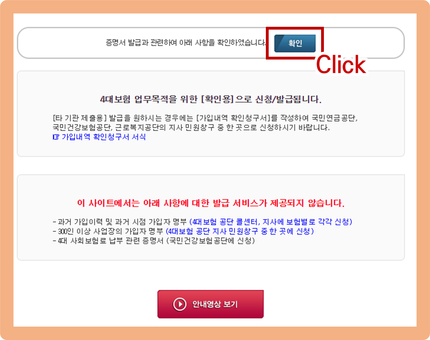 4대보험 가입확인서, 내역서 발급과 관련된 여러 안내 사항을 확인해주신 후, '확인'버튼을 클릭해주세요.