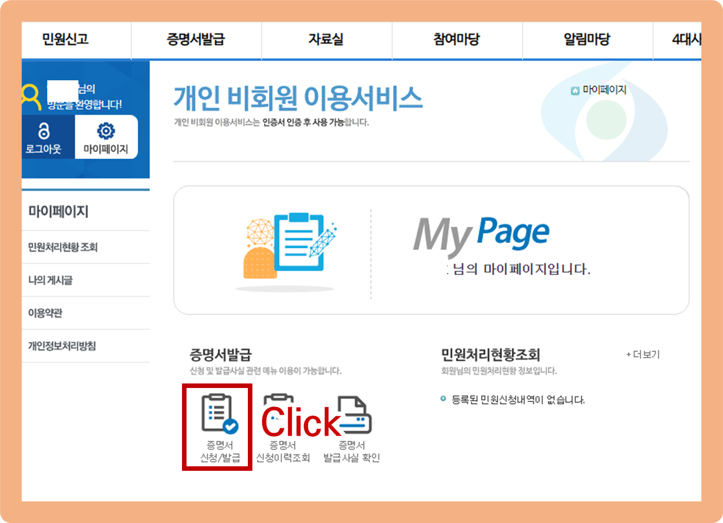 본인인증을 완료하셨으면 다음과 같은 화면이 보일텐데, '증명서 신청/발급' 버튼을 다시 클릭해주세요.