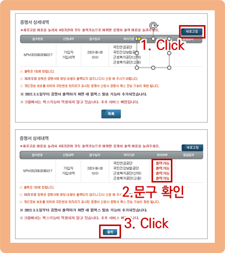 4대보험 가입내역확인서 발급 방법, 새로고침 누르기