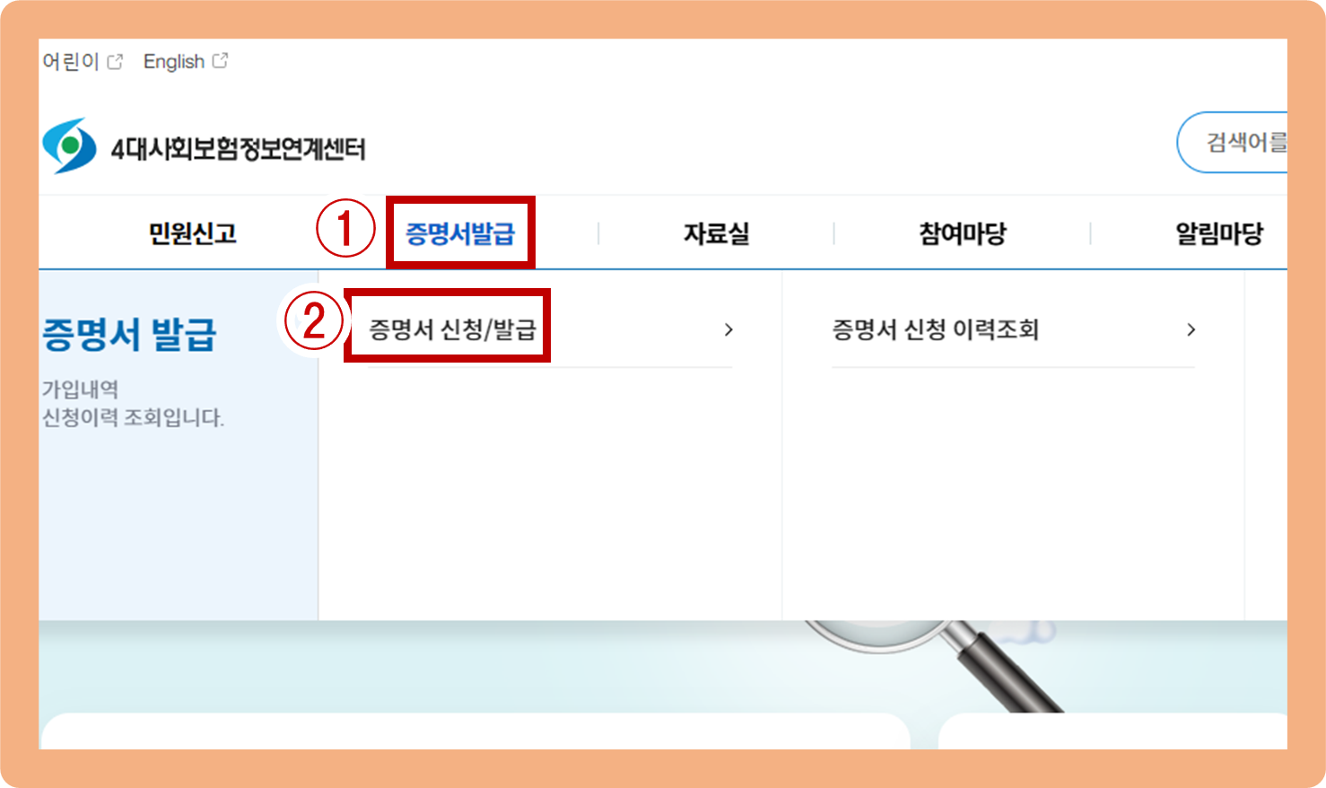 4대보험 가입내역확인서 발급 방법, 증명서 신청/발급 메뉴