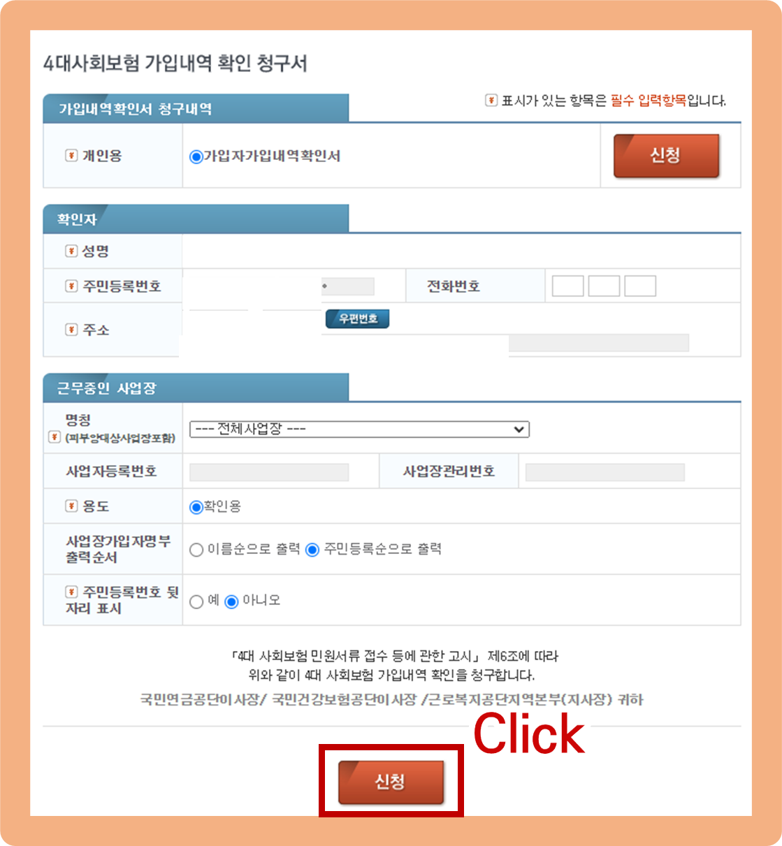 4대보험 가입내역확인서 발급 방법, 확인 버튼