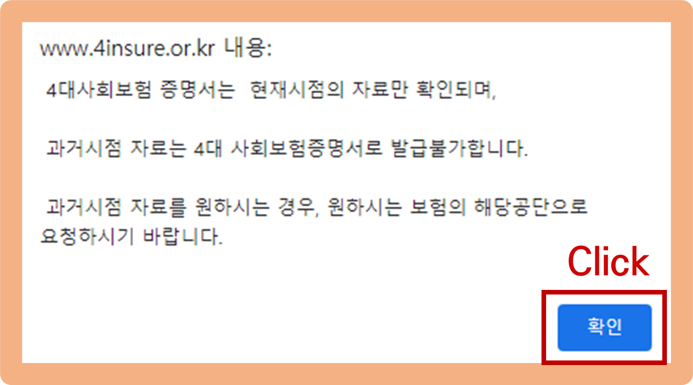 4대보험 가입확인내역서는 현재시점만 확인할 수 있으며, 과거시점 자료를 원하시는 분은 보험의 해당 공단으로 요청하라는 문구가 나와요. 다음 단계 진행을 위해 확인을 클릭해주세요.