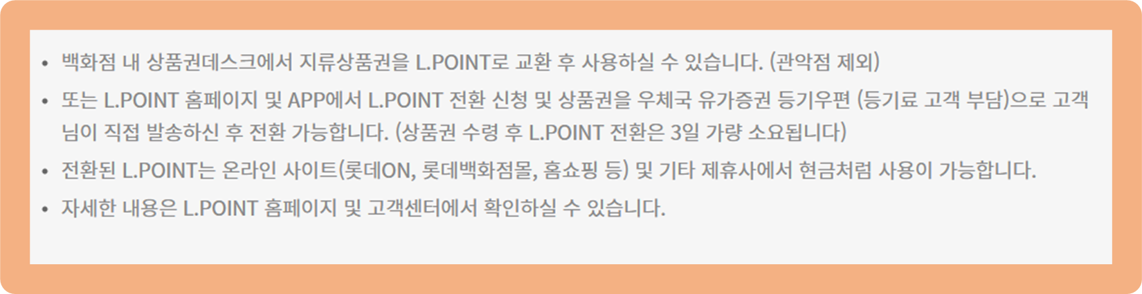이상으로 롯데 상품권 사용처와 엘포인트 전환 방법에 대해 알아봤어요. 감사합니다.