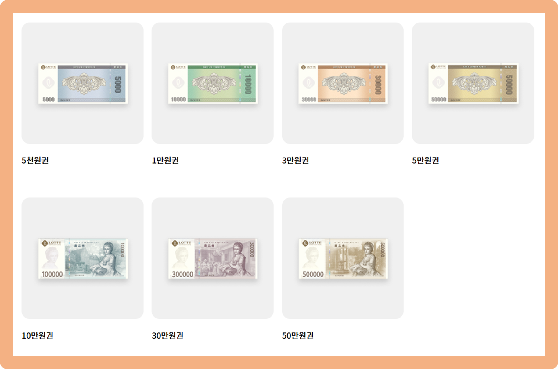롯데상품권은 최저 5천원권, 1만원권, 3만원권, 5만원권, 10만원권, 30만원권, 50만원권이 있어요.