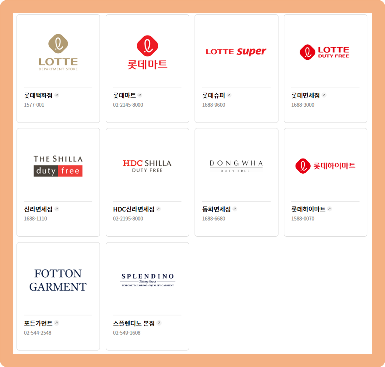 당연히 '롯데'가 들어간 백화점, 마트, 면세점, 슈퍼 등에서 사용할 수 있구요. 그외 신라면세점, 포튼가먼트 등의 쇼핑 매장에서도 사용할 수 있어요.