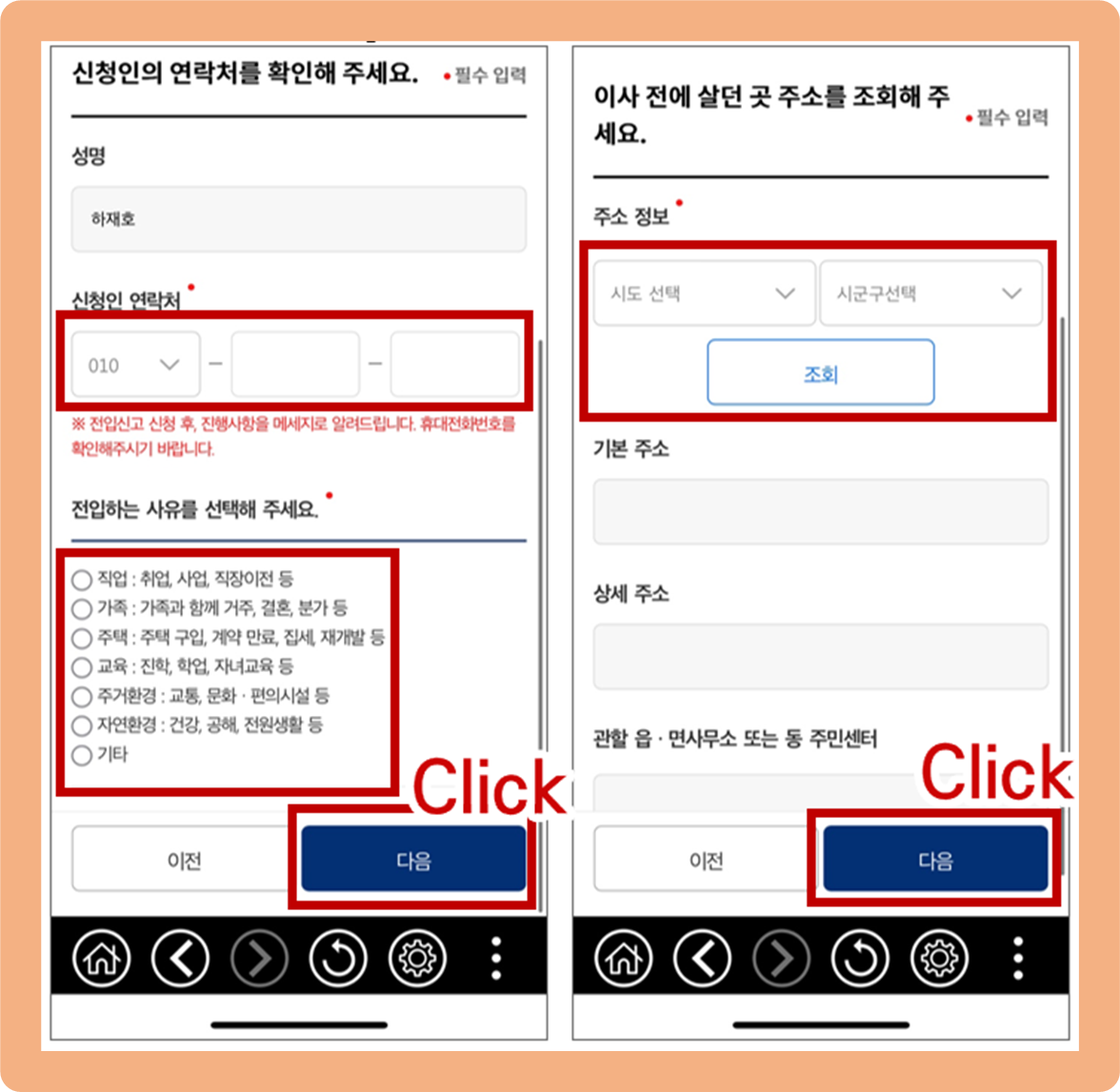 모바일 전입신고 신청 방법. 연락처 입력 및 전에 살던 곳 주소 조회