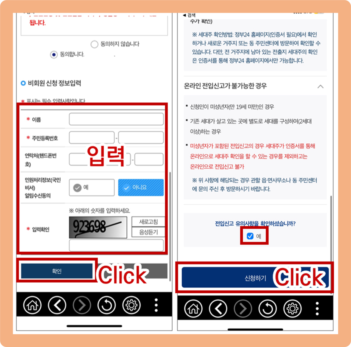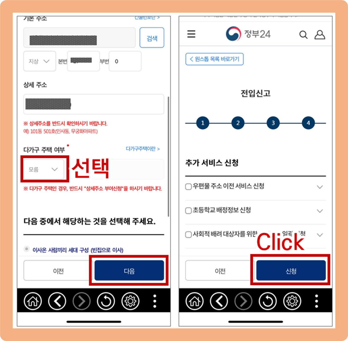 모바일 전입신고 신청 방법. 개인정보 입력 후 신청하기